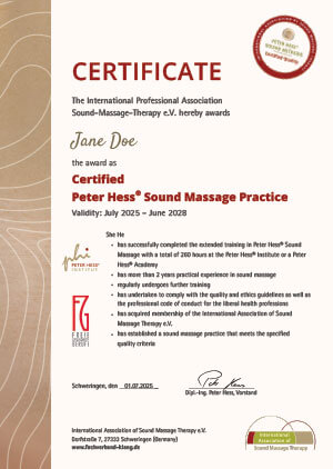 “Certified Sound Massage Practitioners” and owners of “Certified Sound Massage Practices” have undergone solid training at the Peter Hess® Institute or a Peter Hess® Academy and are committed to continuous further training.